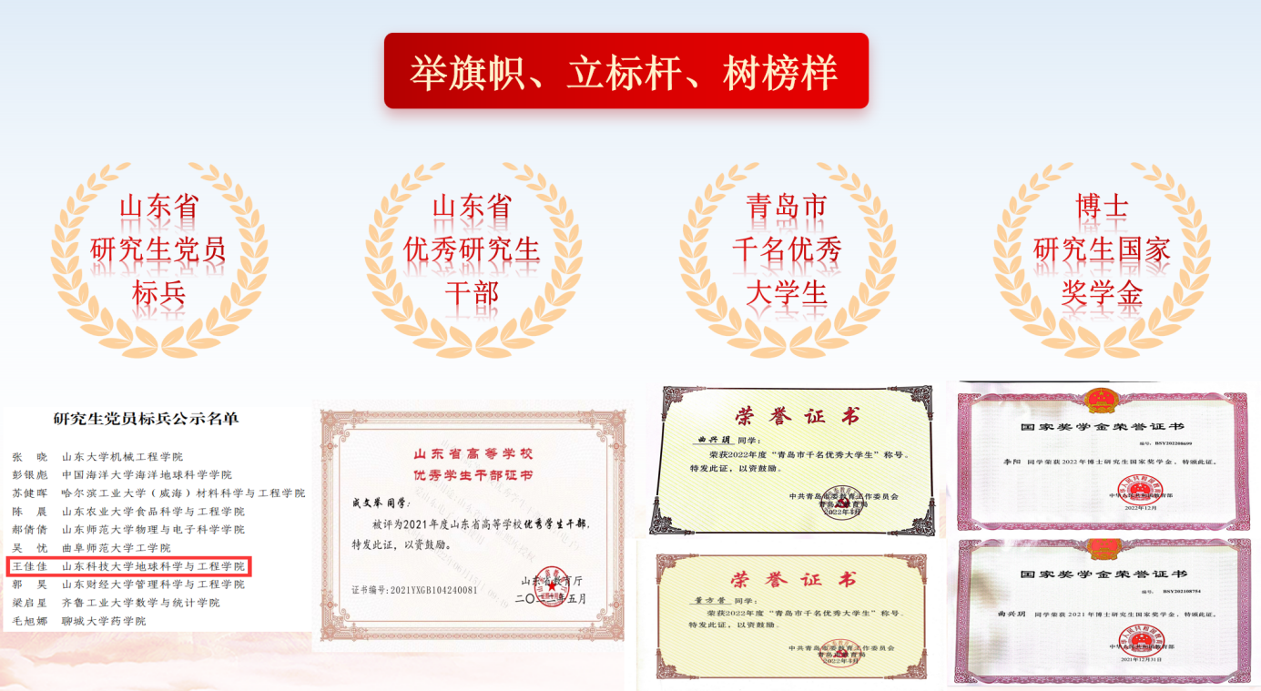 实施“党建+科研创新”,打造创新型党支部。党建引领,点石成金,坚持党建与业务同步谋划、协同发展。支部党员积极提升能力,丰富内涵,取得了丰硕成果。仅近两年获山东省“研究生党员标兵”1人、山东省“优秀研究生干部”1人、青岛市千名优秀老员工2人,博士研究生国家奖学金2人。发表高水平SCI期刊论文18篇(其中top期刊6篇),获山东省优秀成果奖2项,积极参加学术论坛,获优秀报告奖2项。充分发挥党员先锋模范作用,学院学风建设水平进一步提升,领头羊效应显著。